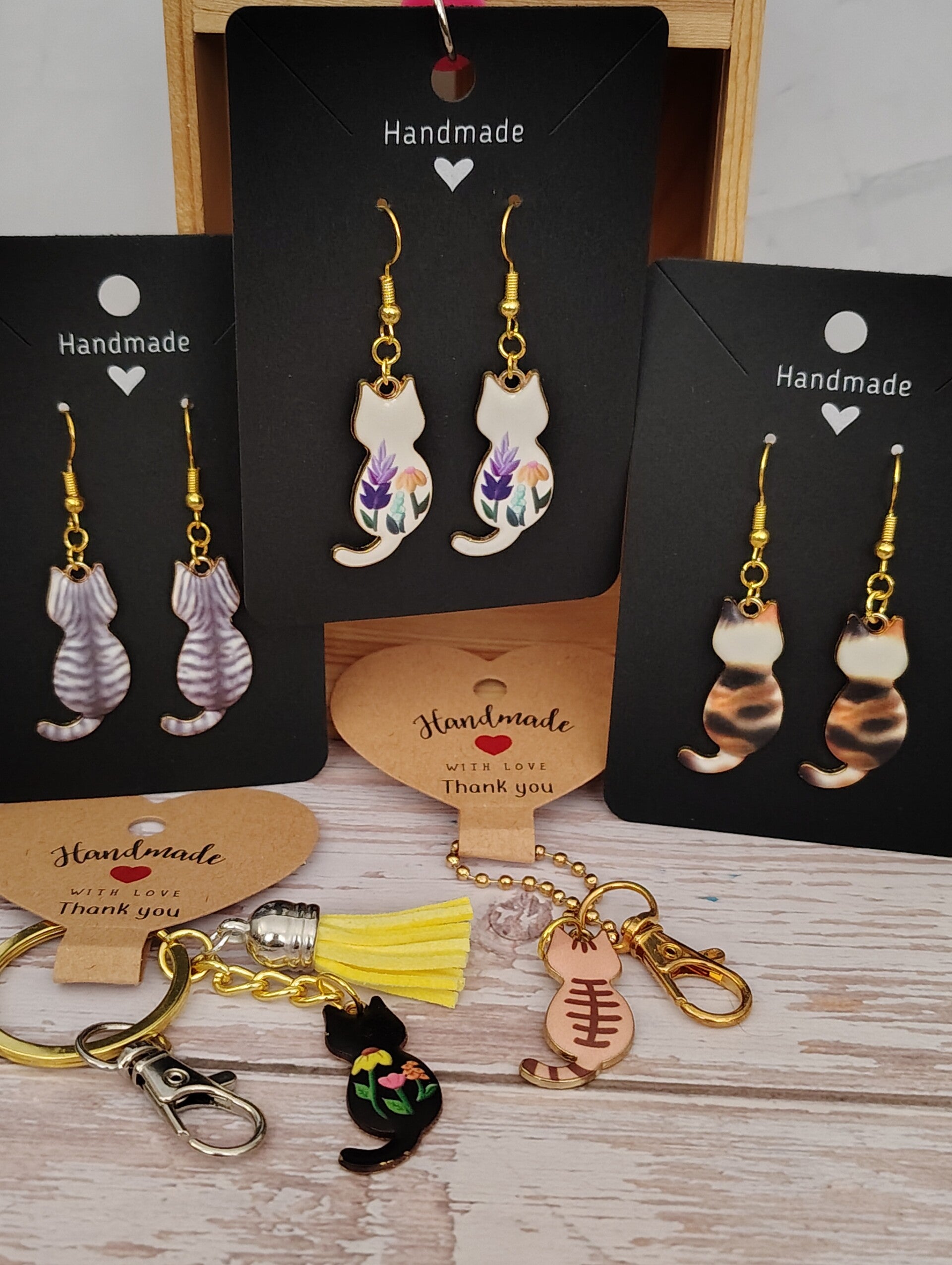 Unlike anything else in Laura's Little World, our Classy Cat Collection brings you beautifully Enamel and gold colored earrings and keychains. Each piece is a wearable work of art, designed to celebrate the sophisticated allure of our feline friends. These aren't just accessories; they're conversation starters, perfect for anyone who appreciates unique, handcrafted elegance.
